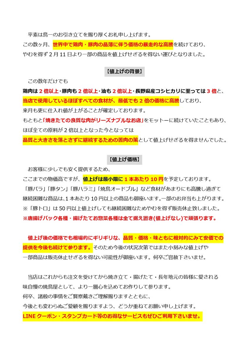 - 原材料費の急激な高騰に伴い2月11日より一部商品の価格を改定致します。